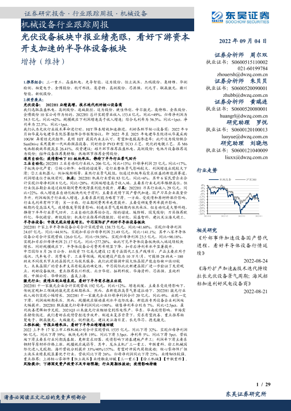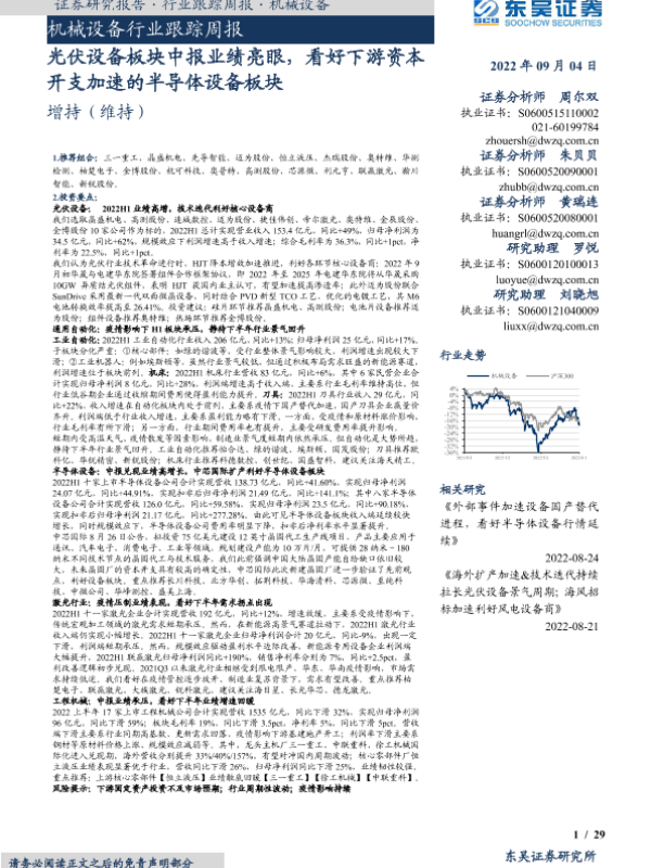 【东吴证券】【20220904】20220904-东吴证券-机械设备行业跟踪周报:光伏设备板块中报业绩亮眼,看好下游资本开支加速的半导体设备板块-29页