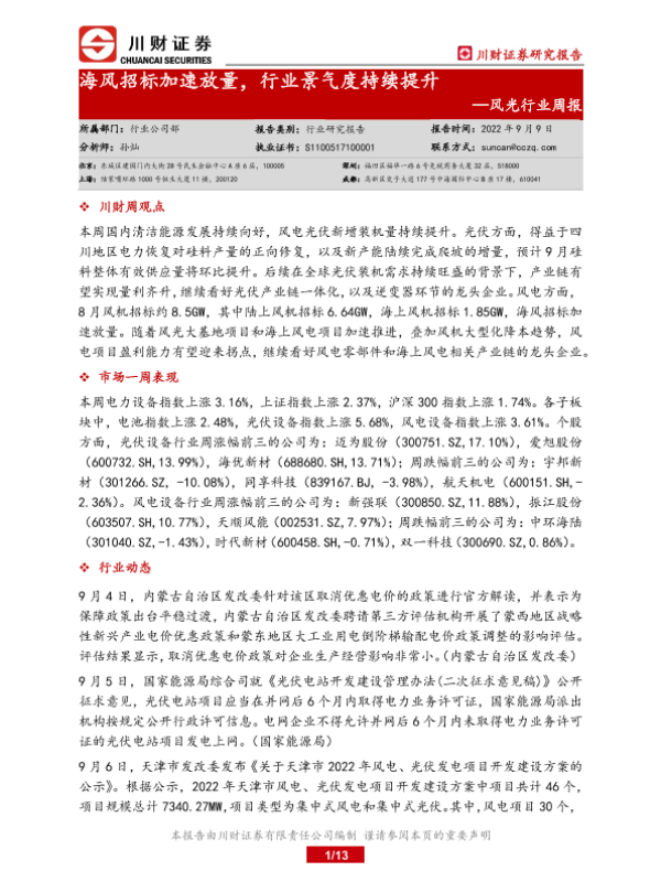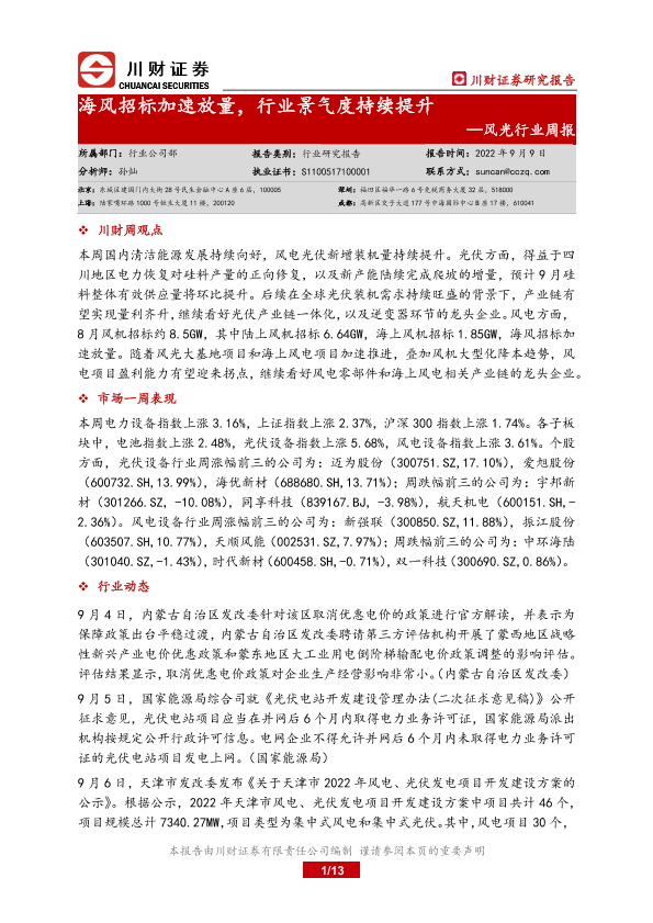 【川财证券】【20220909】风光行业周报:海风招标加速放量,行业景气度持续提升-13页