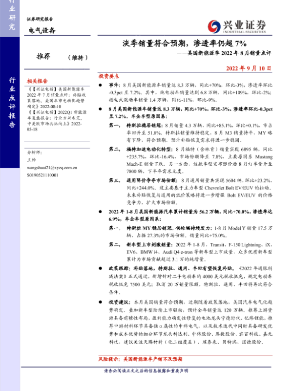 【兴业证券】【20220910】淡季销量符合预期,渗透率仍超 7%——美国新能源车2022年8月销量点评-9页