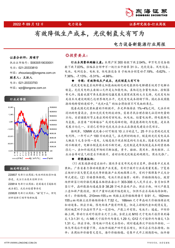 【东海证券】【20220912】电力设备新能源行业周报:有效降低生产成本,光伏制氢大有可为-29页