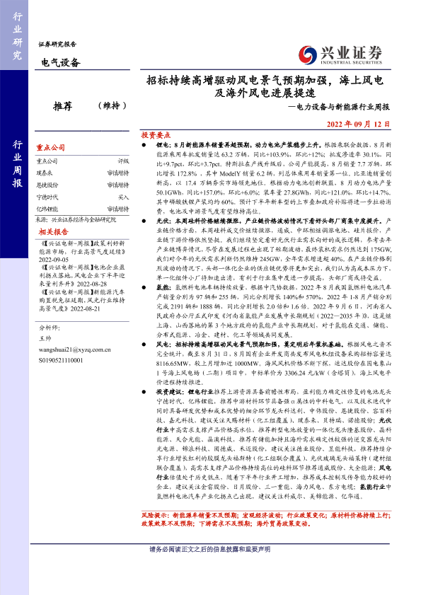 【兴业证券】【20220912】20220912-兴业证券-电力设备与新能源行业周报:招标持续高增驱动风电景气预期加强,海上风电及海外风电进展提速-20页