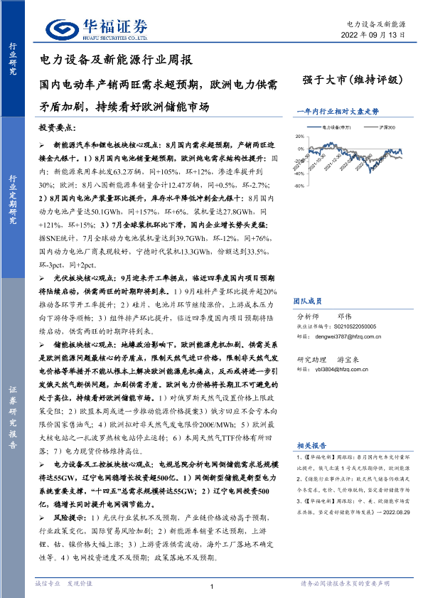 【华福证券】【20220913】电力设备及新能源行业周报:国内电动车产销两旺需求超预期,欧洲电力供需矛盾加剧,持续看好欧洲储能市场-9页