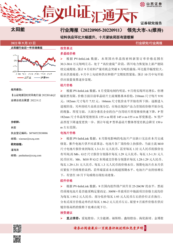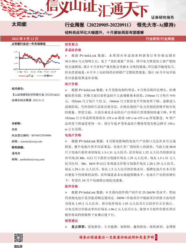【山西证券】【20220913】太阳能行业周报:硅料供应环比大幅提升,十月紧缺局面有望缓解-4页