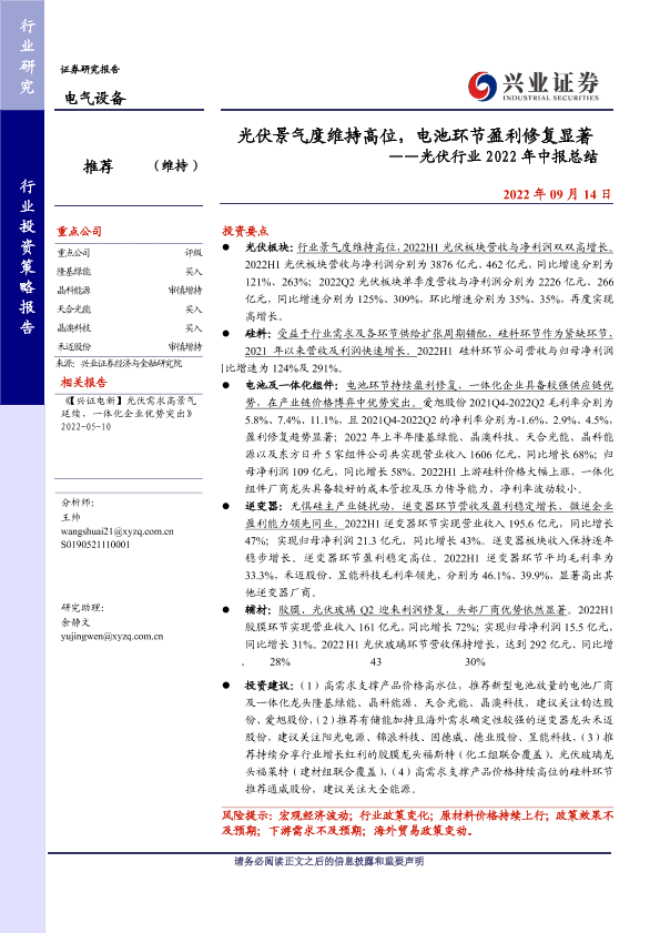 【兴业证券】【20220914】光伏景气度维持高位,电池环节盈利修复显著——光伏行业2022年中报总结-22页