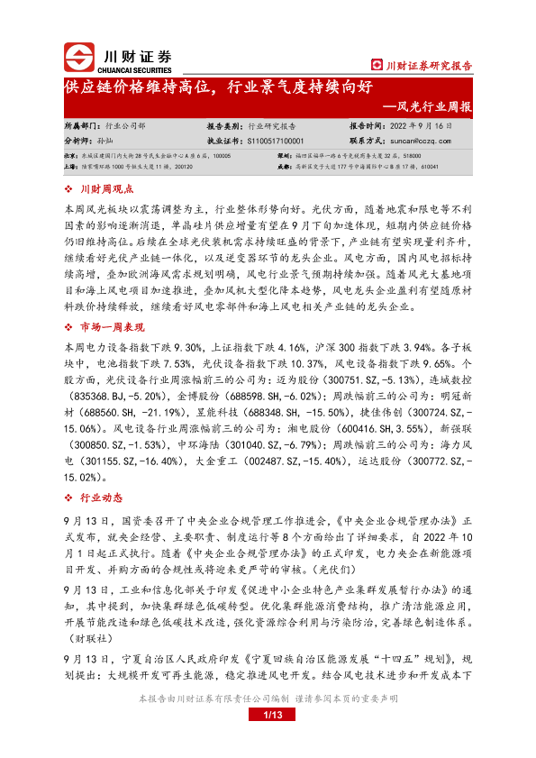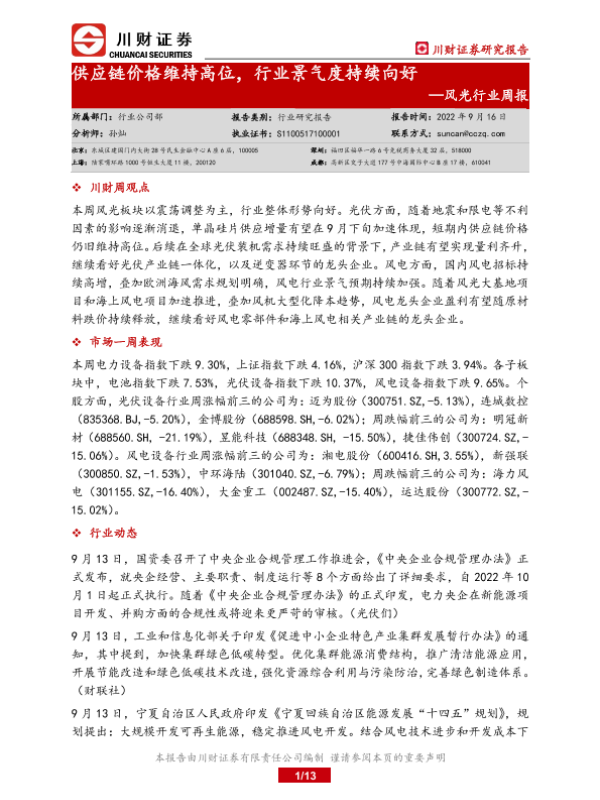 【川财证券】【20220916】风光行业周报:供应链价格维持高位,行业景气度持续向好-13页