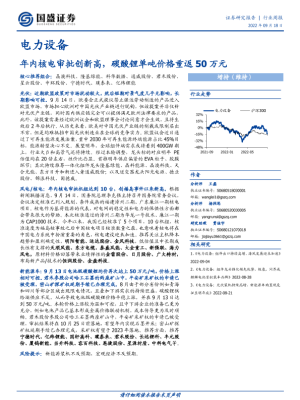 【国盛证券】【20220918】20220918-国盛证券-电力设备行业周报:年内核电审批创新高,碳酸锂单吨价格重返50万元-15页