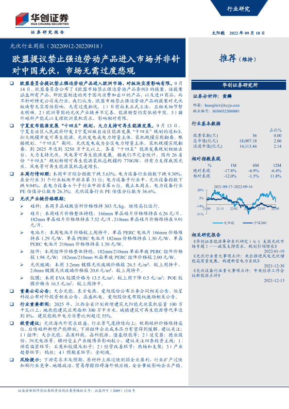 【华创证券】【20220918】光伏行业周报:欧盟提议禁止强迫劳动产品进入市场并非针对中国光伏,市场无需过度悲观-15页