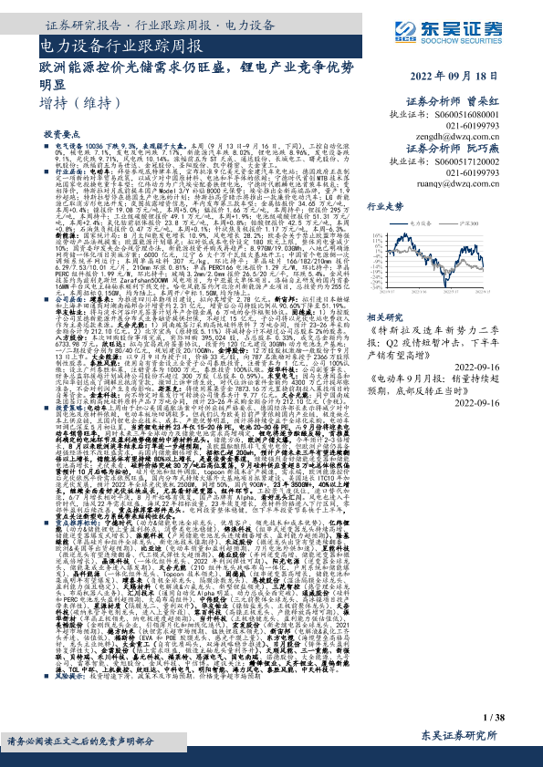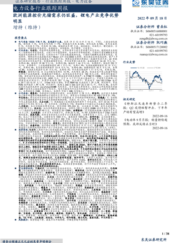 【东吴证券】【20220918】电力设备行业跟踪周报:欧洲能源控价光储需求仍旺盛,锂电产业竞争优势明显-38页