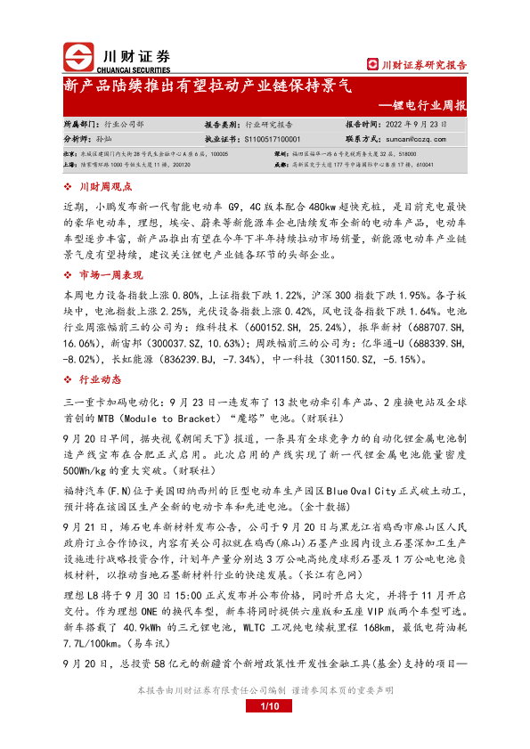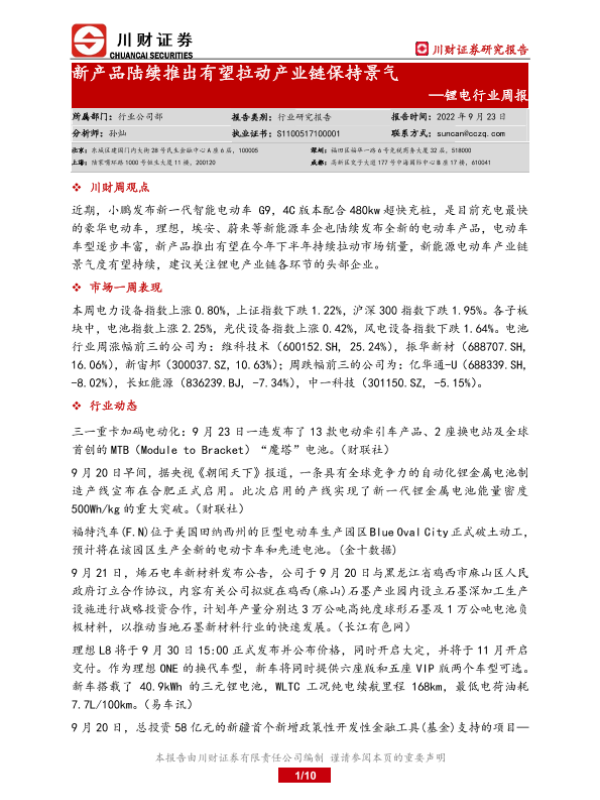 【川财证券】【20220923】20220923-川财证券-锂电行业周报:新产品陆续推出有望拉动产业链保持景气-10页