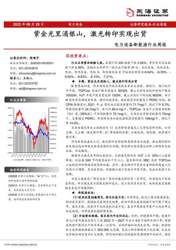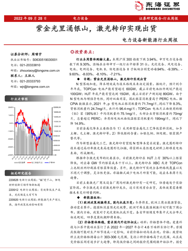 【东海证券】【20220928】电力设备新能源行业周报:紫金光里涌银山,激光转印实现出货-32页