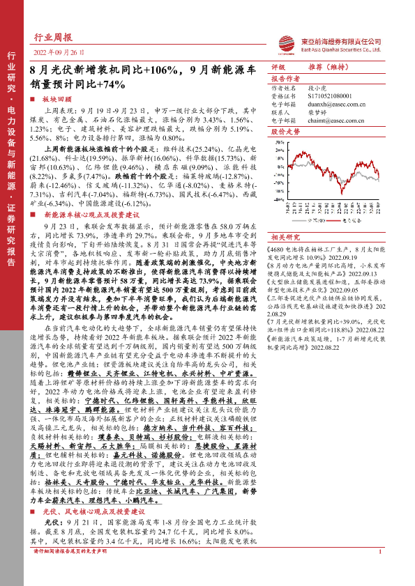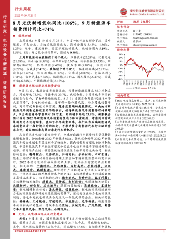 【东亚前海证券】【20220926】电力设备与新能源行业周报:8月光伏新增装机同比+106%,9月新能源车销量预计同比+74%-27页