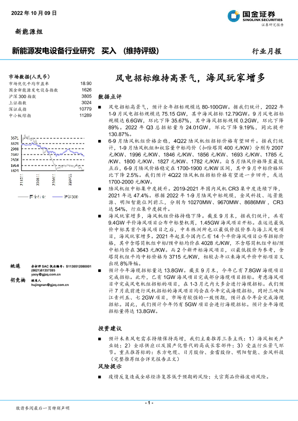 【国金证券】【20221009】新能源发电设备行业研究:风电招标维持高景气,海风玩家增多-15页