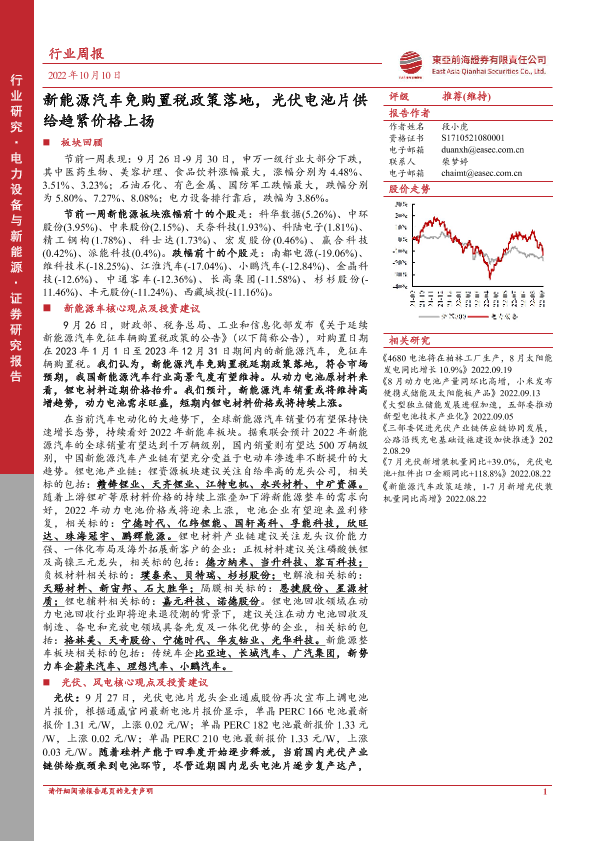 【东亚前海证券】【20221010】电力设备与新能源行业周报:新能源汽车免购置税政策落地,光伏电池片供给趋紧价格上扬-24页