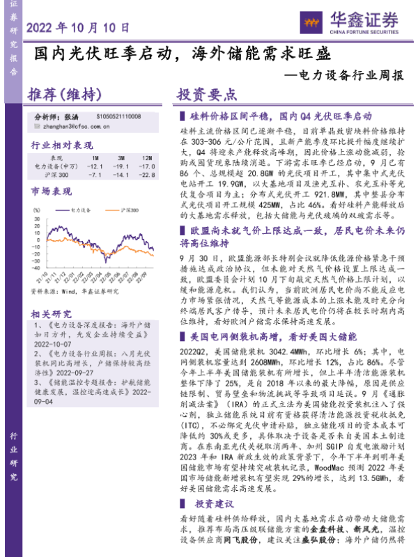【华鑫证券】【20221010】电力设备行业周报:国内光伏旺季启动,海外储能需求旺盛-12页