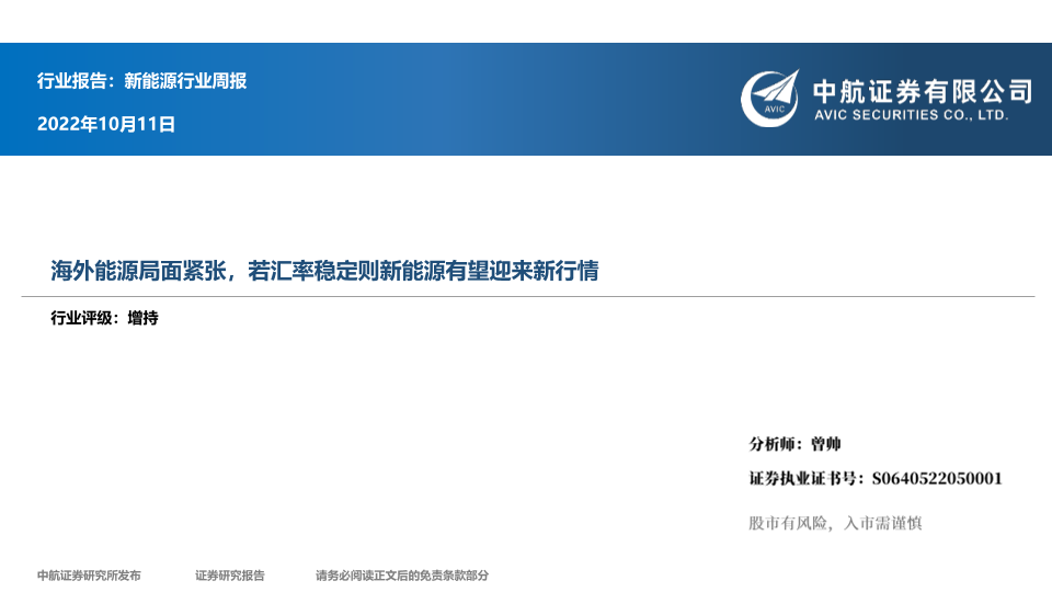 【中航证券】【20221011】20221011-中航证券-新能源行业周报:海外能源局面紧张,若汇率稳定则新能源有望迎来新行情-14页