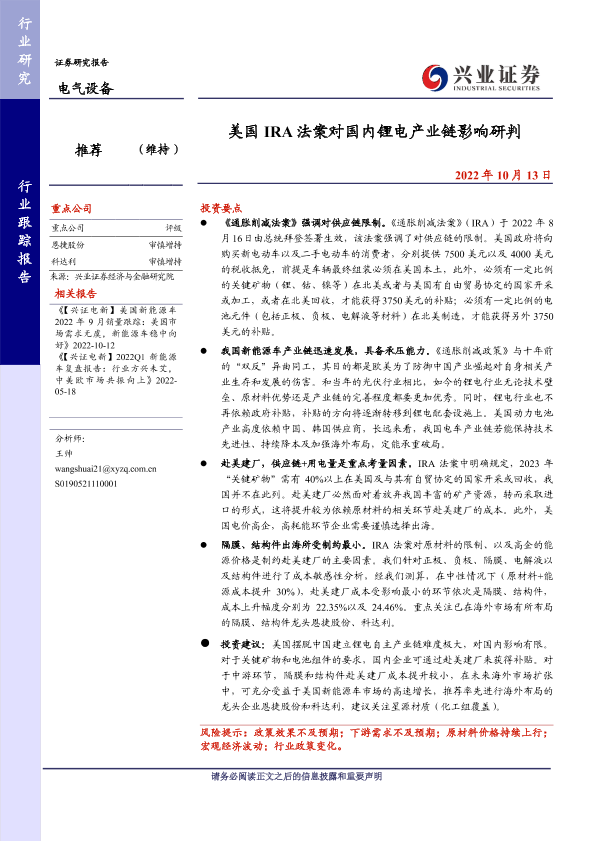 【兴业证券】【20221013】美国 IRA法案对国内锂电产业链影响研判-19页