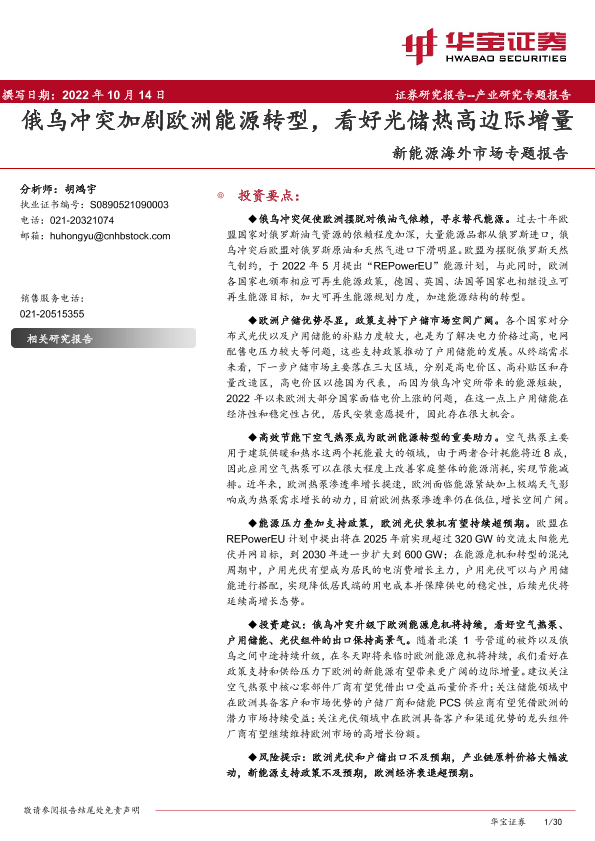 【华宝证券】【20221014】20221014-华宝证券-新能源海外市场专题报告:俄乌冲突加剧欧洲能源转型,看好光储热高边际增量-30页