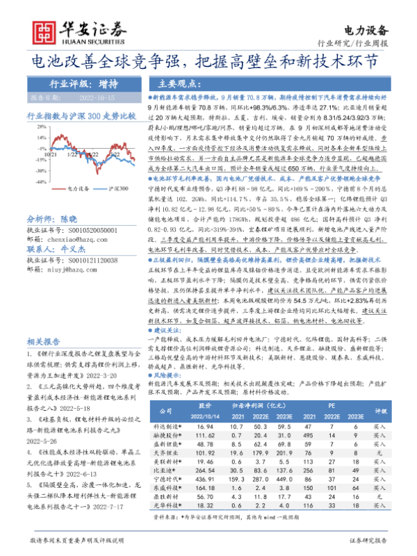 【华安证券】【20221015】电力设备行业周报:电池改善全球竞争强,把握高壁垒和新技术环节-27页