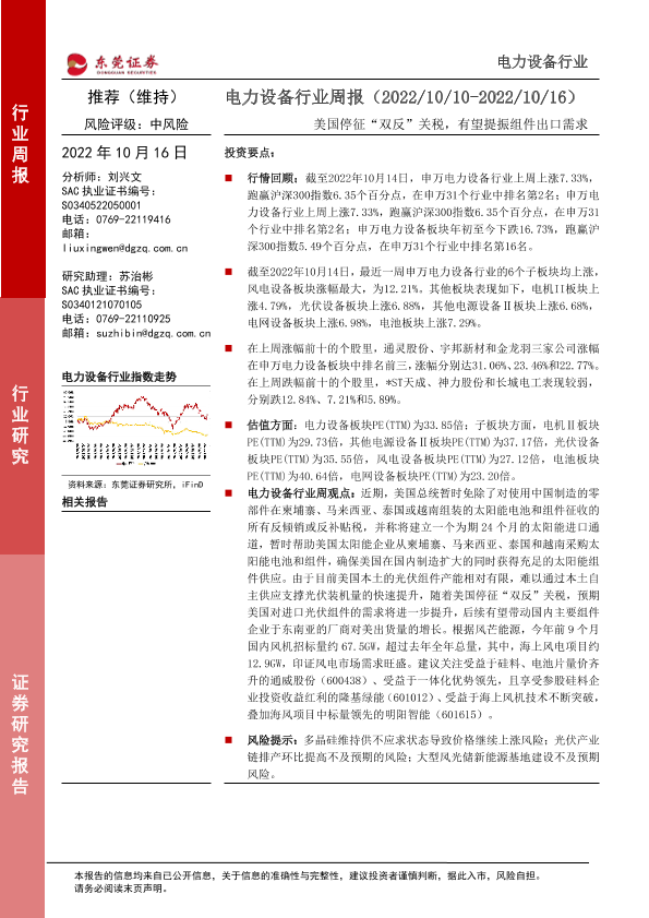 【东莞证券】【20221016】电力设备行业周报:美国停征“双反”关税,有望提振组件出口需求-13页