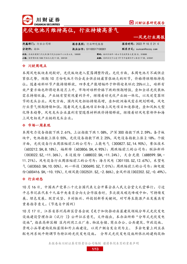 【川财证券】【20221021】风光行业周报:光伏电池片维持高位,行业持续高景气-13页