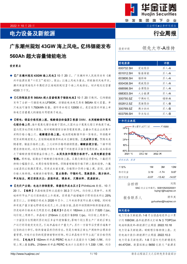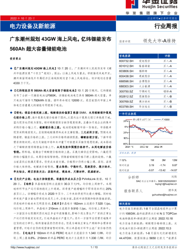 【华金证券】【20221023】电力设备及新能源行业周报:广东潮州规划43GW海上风电,亿纬锂能发布560Ah超大容量储能电池-10页
