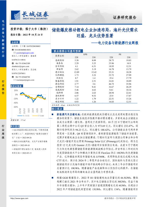 【长城证券】【20221024】电力设备与新能源行业周报:储能爆发推动锂电企业加速布局,海外光伏需求旺盛,龙头优势显著-15页