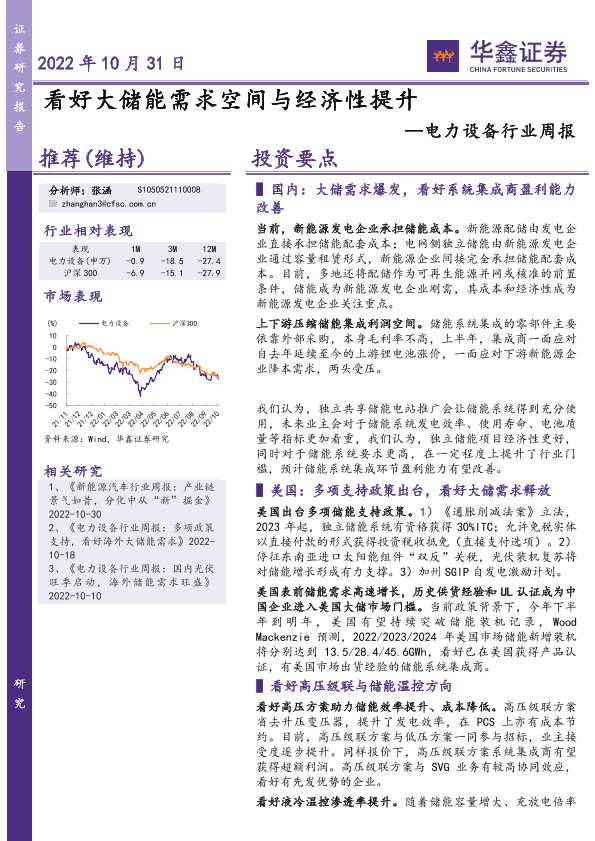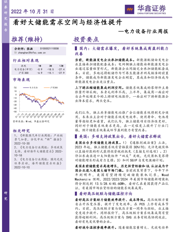 【华鑫证券】【20221031】20221031-华鑫证券-电力设备行业周报:看好大储能需求空间与经济性提升-22页