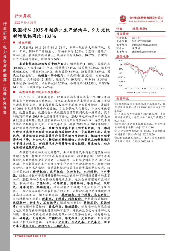 【东亚前海证券】【20221031】电力设备与新能源行业周报:欧盟将从2035年起禁止生产燃油车,9月光伏新增装机同比+133%-28页