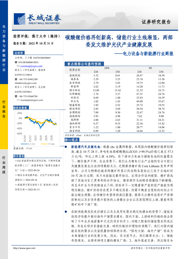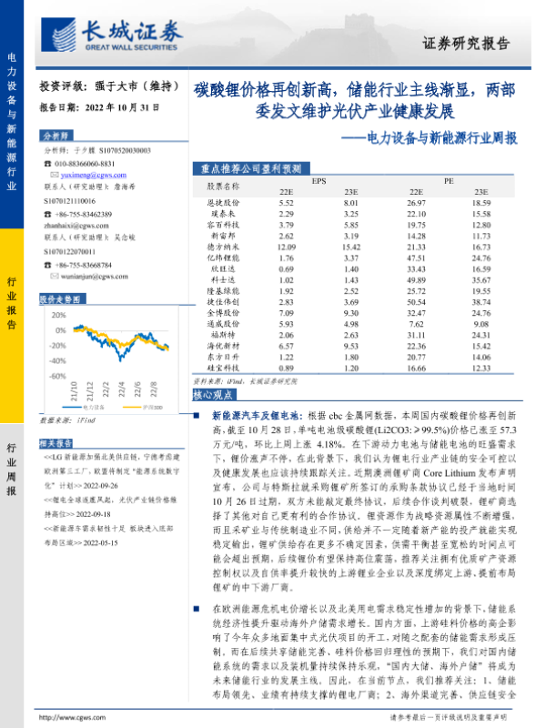 【长城证券】【20221031】20221031-长城证券-电力设备与新能源行业周报:碳酸锂价格再创新高,储能行业主线渐显,两部委发文维护光伏产业健康发展-15页
