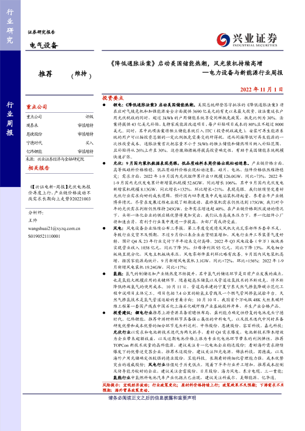 【兴业证券】【20221101】《降低通胀法案》启动美国储能热潮,风光装机持续高增 —电力设备与新能源行业周报-21页