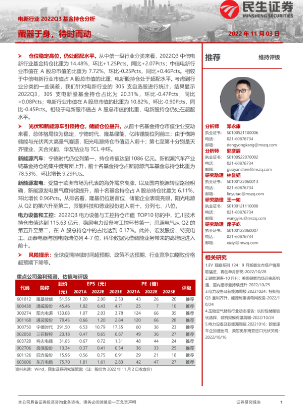 【民生证券】【20221103】电新行业2022Q3基金持仓分析:藏器于身,待时而动-12页