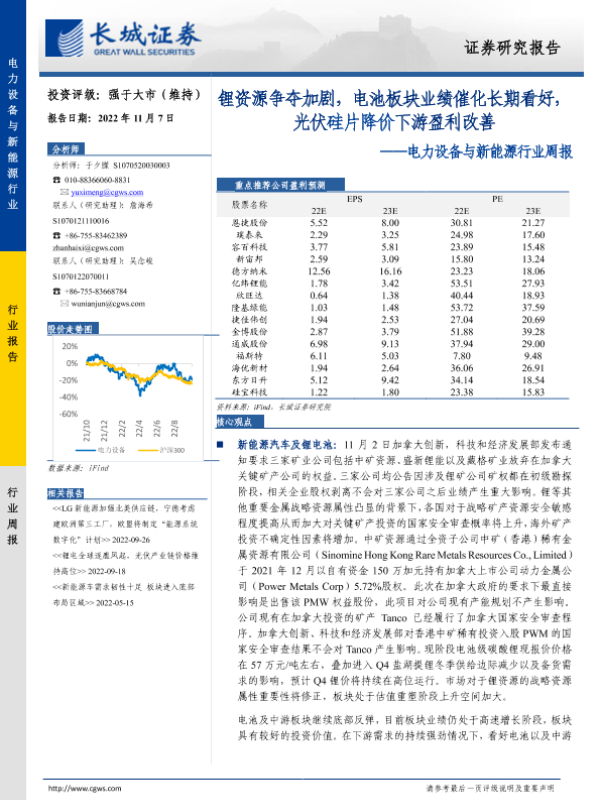 【长城证券】【20221107】20221107-长城证券-电力设备与新能源行业周报:锂资源争夺加剧,电池板块业绩催化长期看好,光伏硅片降价下游盈利改善-15页