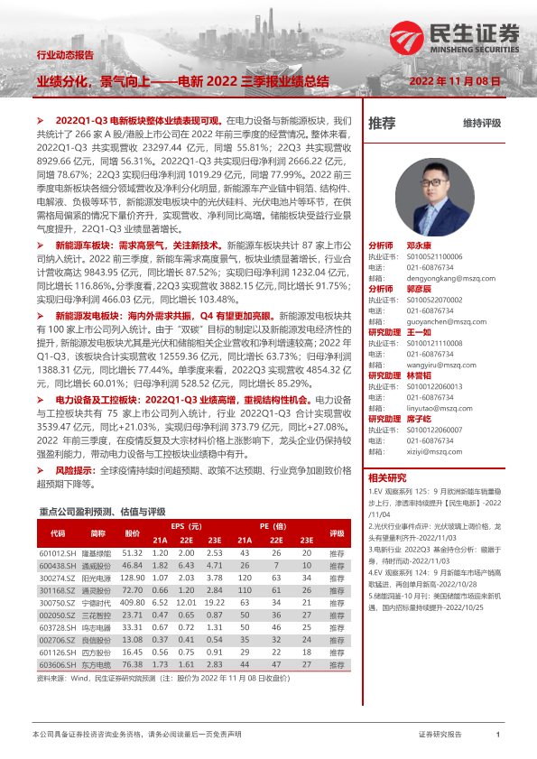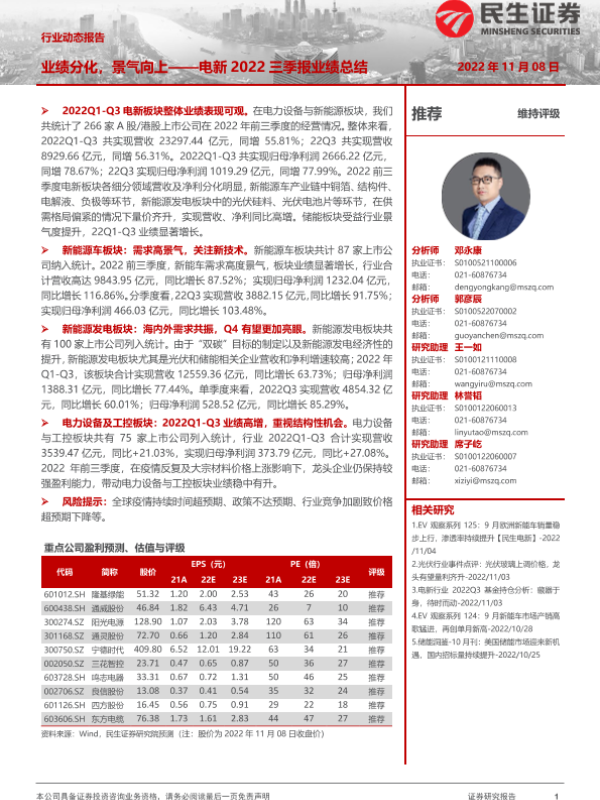 【民生证券】【20221108】电新2022三季报业绩总结:业绩分化,景气向上-44页