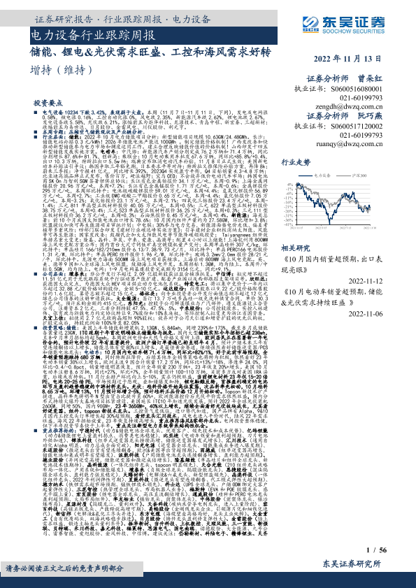 【东吴证券】【20221113】电力设备行业跟踪周报:储能、锂电&光伏需求旺盛、工控和海风需求好转-56页