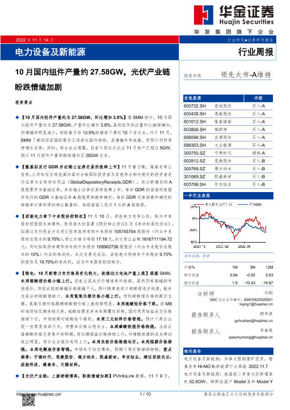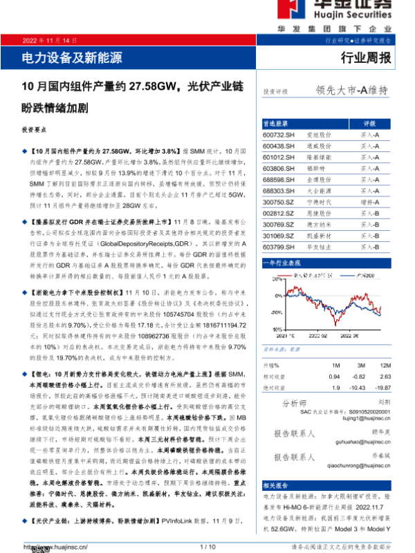 【华金证券】【20221114】电力设备及新能源行业周报:10月国内组件产量约27.58GW,光伏产业链盼跌情绪加剧-10页