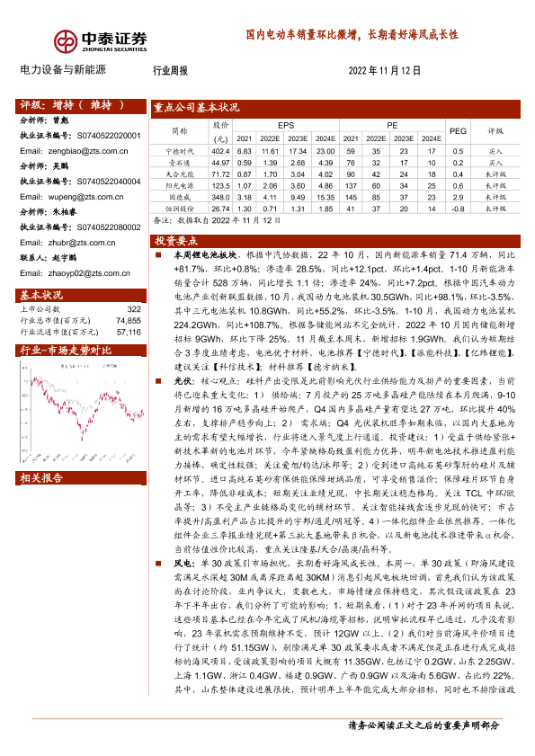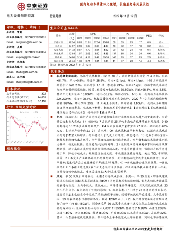 【中泰证券】【20221113】20221113-中泰证券-电力设备与新能源行业周报:国内电动车销量环比微增,长期看好海风成长性-30页