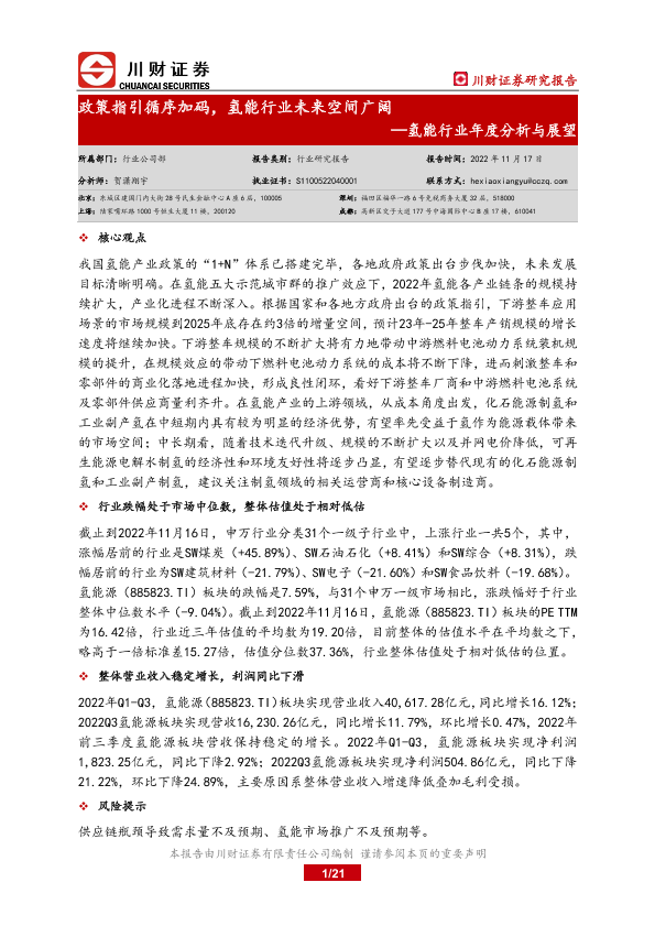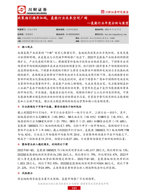 【川财证券】【20221117】20221117-川财证券-氢能行业年度分析与展望:政策指引循序加码,氢能行业未来空间广阔-21页