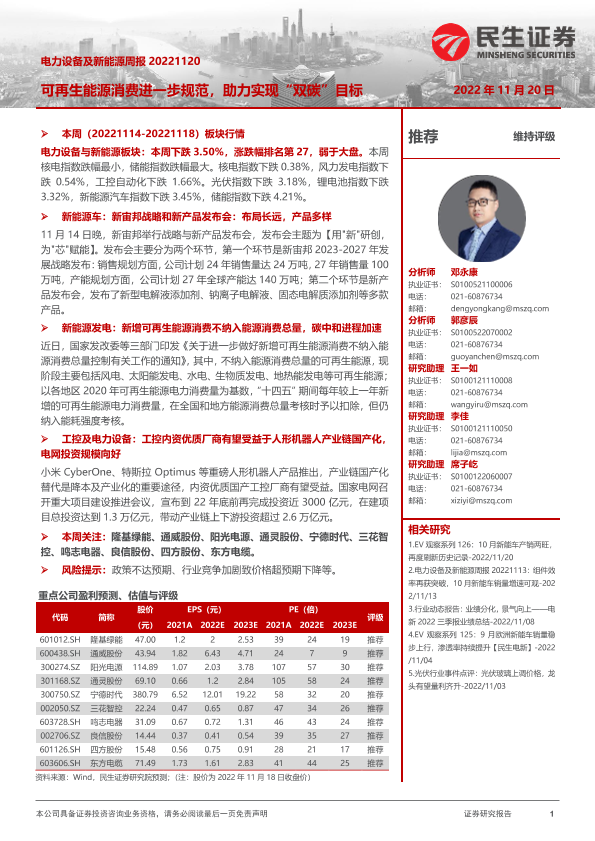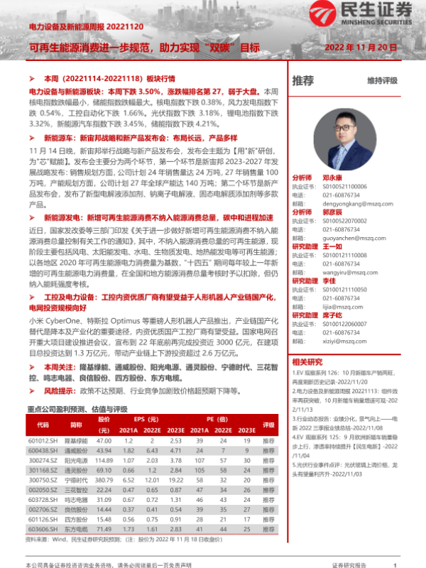 【民生证券】【20221120】电力设备及新能源周报:可再生能源消费进一步规范,助力实现“双碳”目标-30页