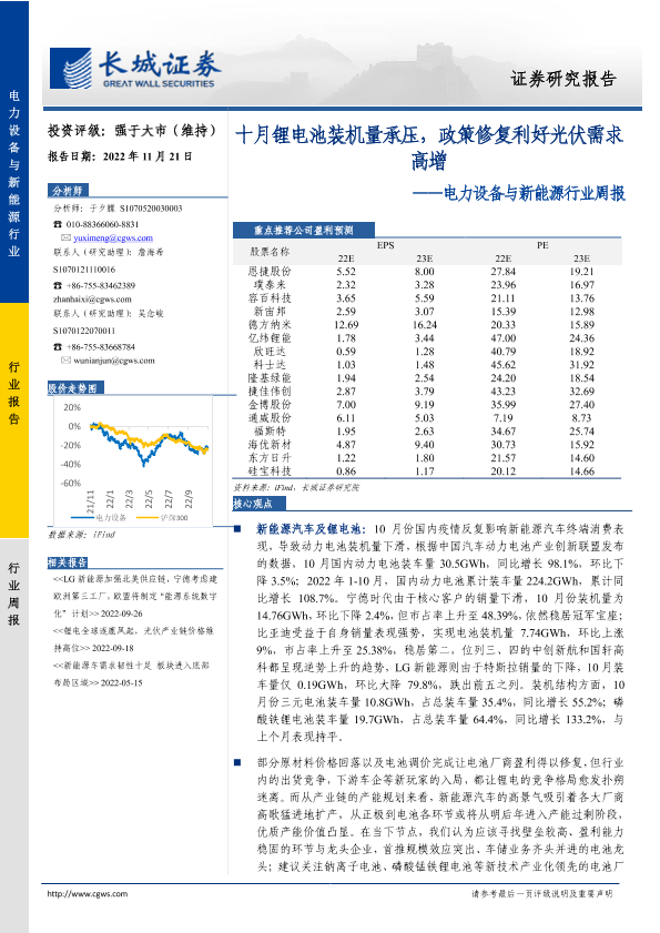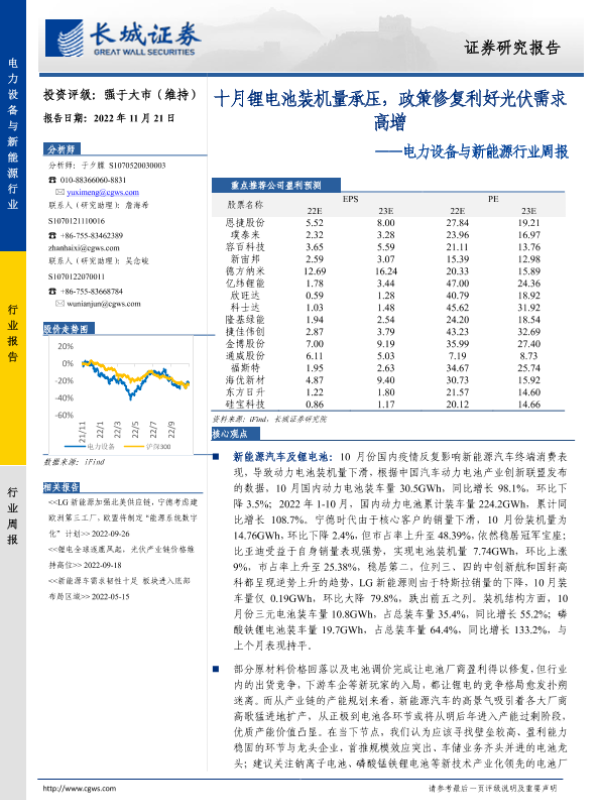 【长城证券】【20221121】20221121-长城证券-电力设备与新能源行业周报:十月锂电池装机量承压,政策修复利好光伏需求高增-15页