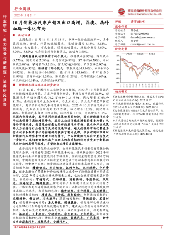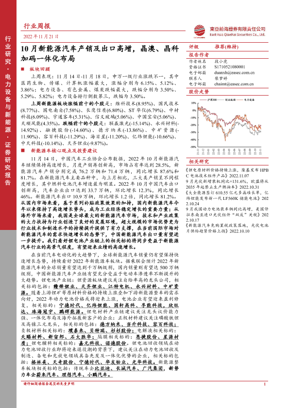 【东亚前海证券】【20221121】20221121-东亚前海证券-电力设备与新能源行业周报:10月新能源汽车产销及出口高增,晶澳、晶科加码一体化布局-25页