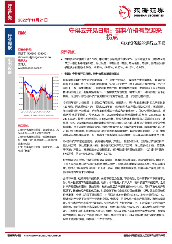 【东海证券】【20221121】20221121-东海证券-电力设备新能源行业周报:守得云开见日明:硅料价格有望迎来拐点-36页