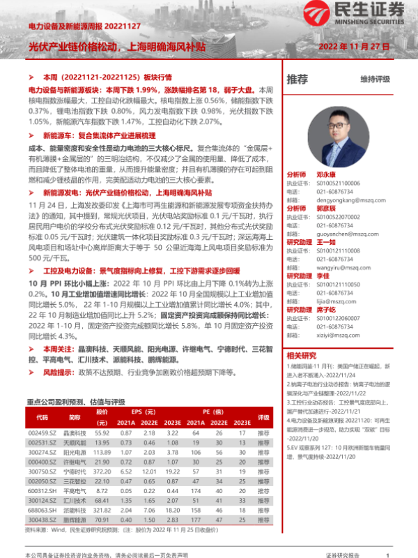 【民生证券】【20221127】电力设备及新能源周报:光伏产业链价格松动,上海明确海风补贴-27页