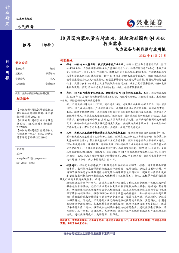 【兴业证券】【20221127】10月国内装机量有所波动,继续看好国内 Q4光伏行业需求—电力设备与新能源行业周报-21页