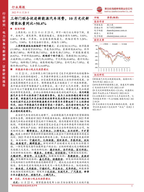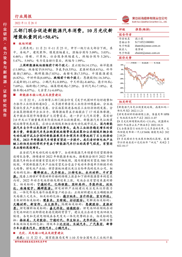 【东亚前海证券】【20221128】电力设备与新能源行业周报:三部门联合促进新能源汽车消费,10月光伏新增装机量同比+50.4%-25页