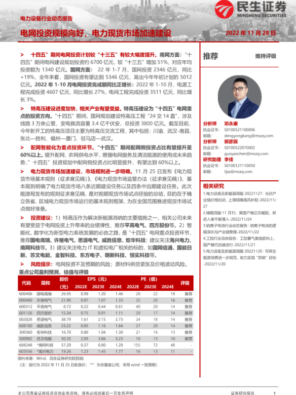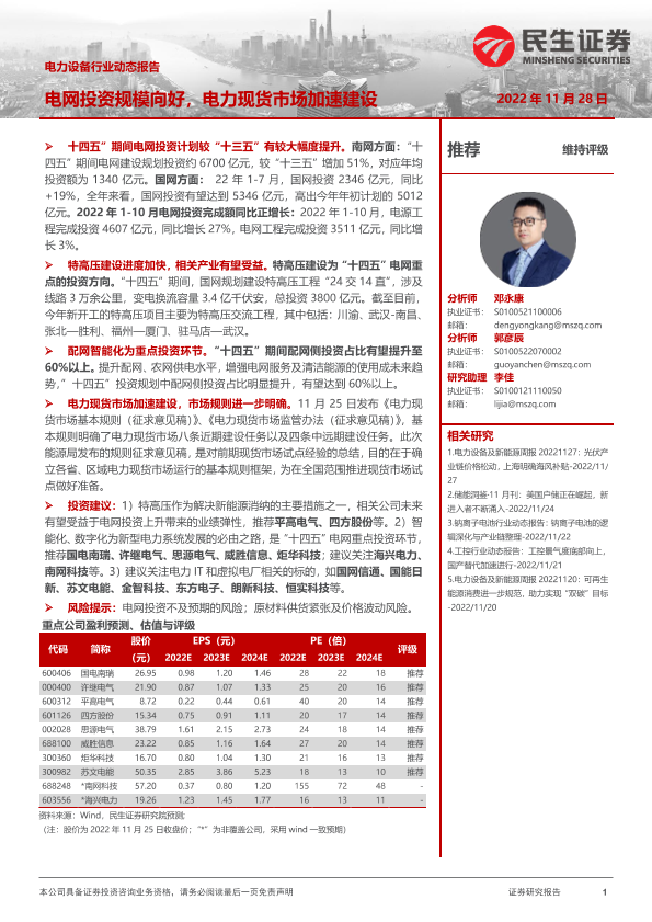 【民生证券】【20221128】电力设备行业动态报告:电网投资规模向好,电力现货市场加速建设-11页