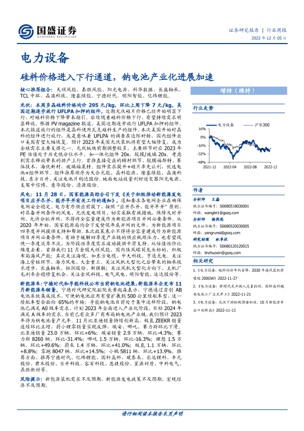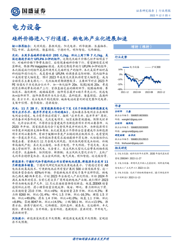 【国盛证券】【20221205】电力设备行业周报:硅料价格进入下行通道,钠电池产业化进展加速-15页