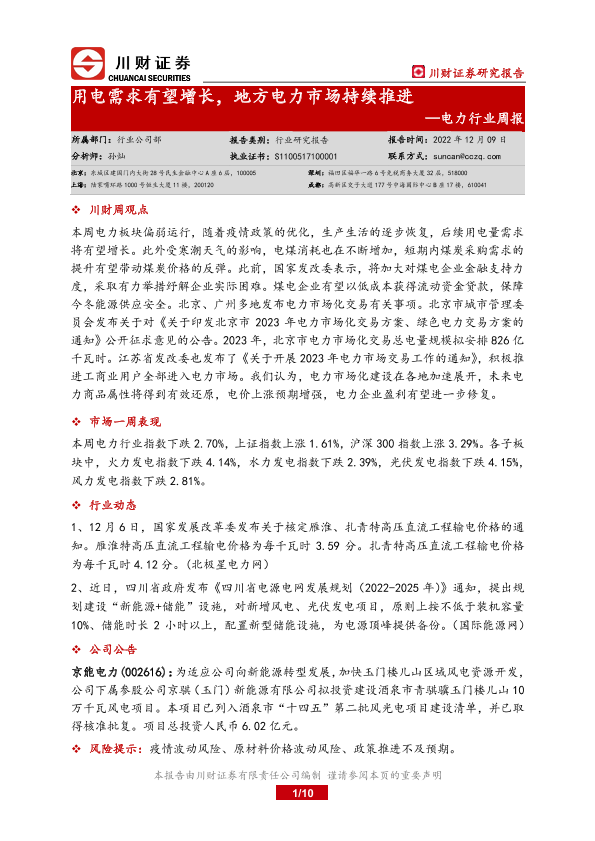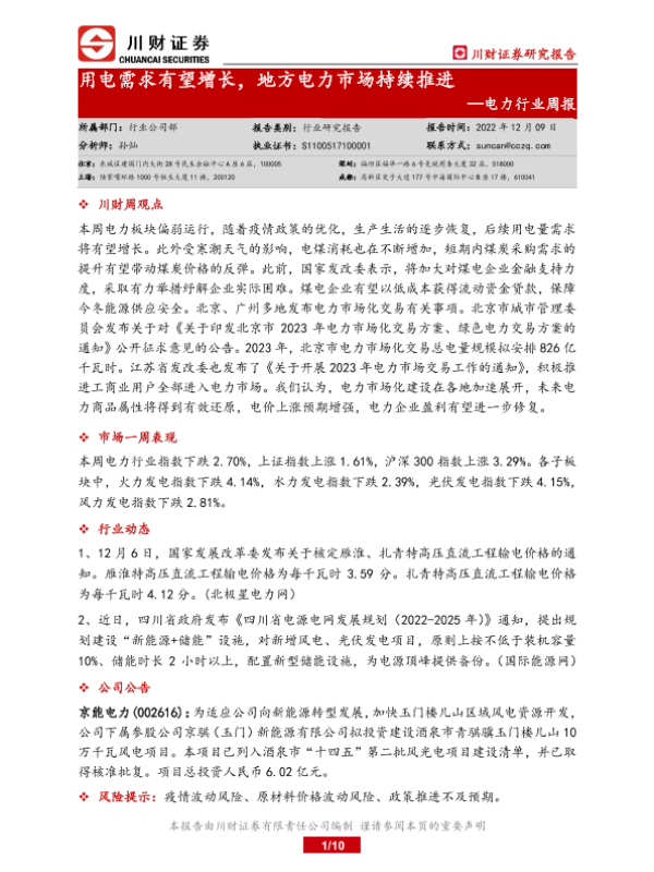 【川财证券】【20221209】20221209-川财证券-电力行业周报:用电需求有望增长,地方电力市场持续推进-10页