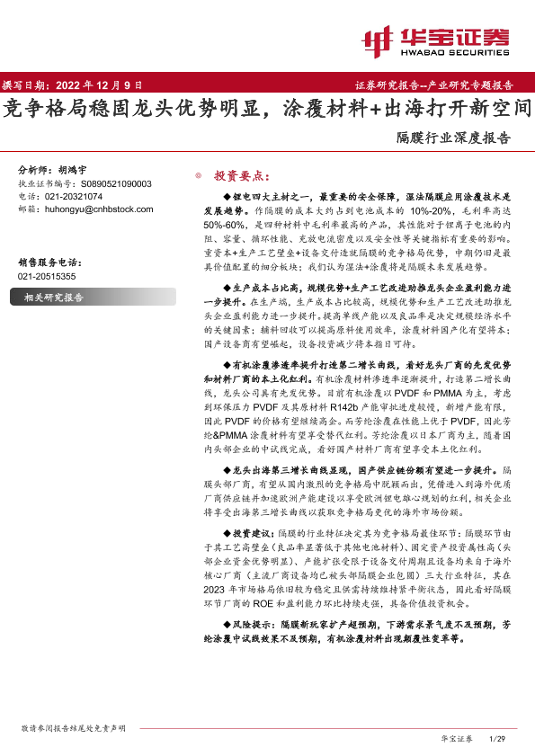 【华宝证券】【20221209】20221209-华宝证券-隔膜行业深度报告:竞争格局稳固龙头优势明显,涂覆材料+出海打开新空间-29页