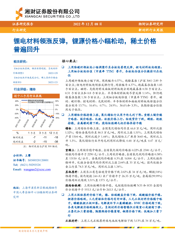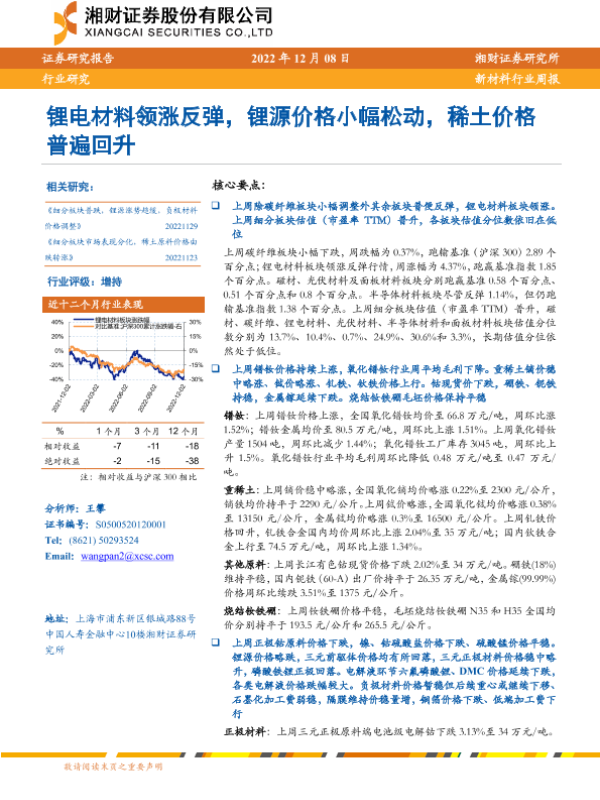 【湘财证券】【20221208】20221208-湘财证券-新材料行业周报:锂电材料领涨反弹,锂源价格小幅松动,稀土价格普遍回升-15页