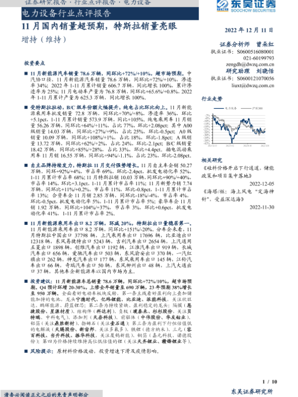 【东吴证券】【20221211】20221211-东吴证券-电力设备行业点评报告:11月国内销量超预期,特斯拉销量亮眼-10页